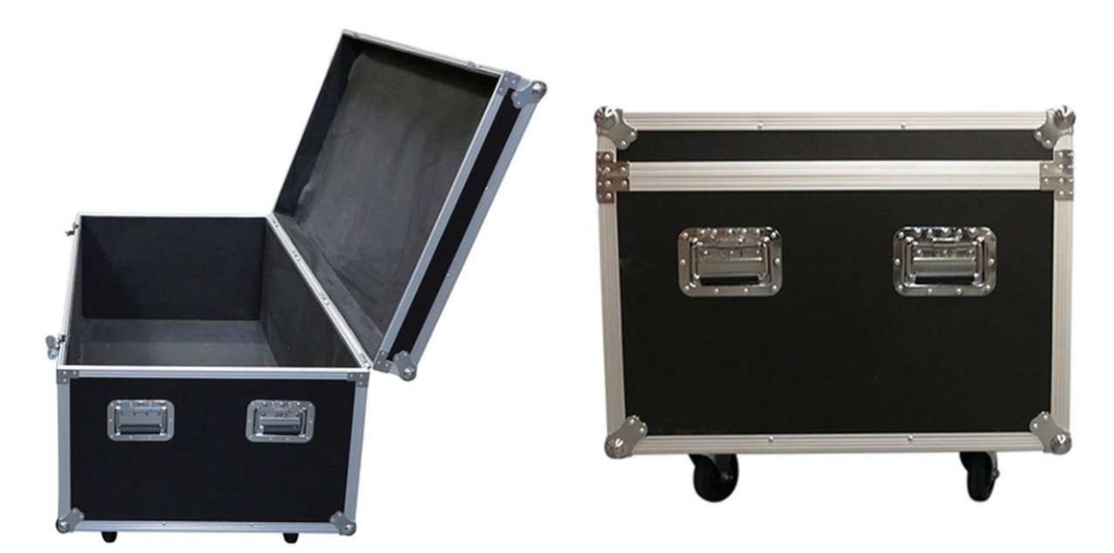 Stevige en sterke transportkist met versterkte verbindingen op alle hoeken en schuim aan de binnenkant. Uitgerust met vier wielen en handgrepen, die het gemakkelijk maken om te verplaatsen. Stapelbaar.