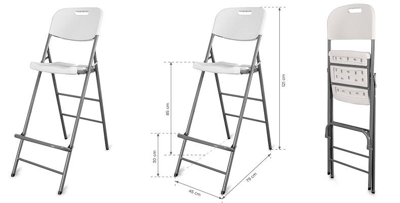 Robuuste inklapbare statafelkruk met stalen poten. Zie voor afmetingen de bijgevoegde afbeeldingen. Optie: hoezen in wit of zwart.