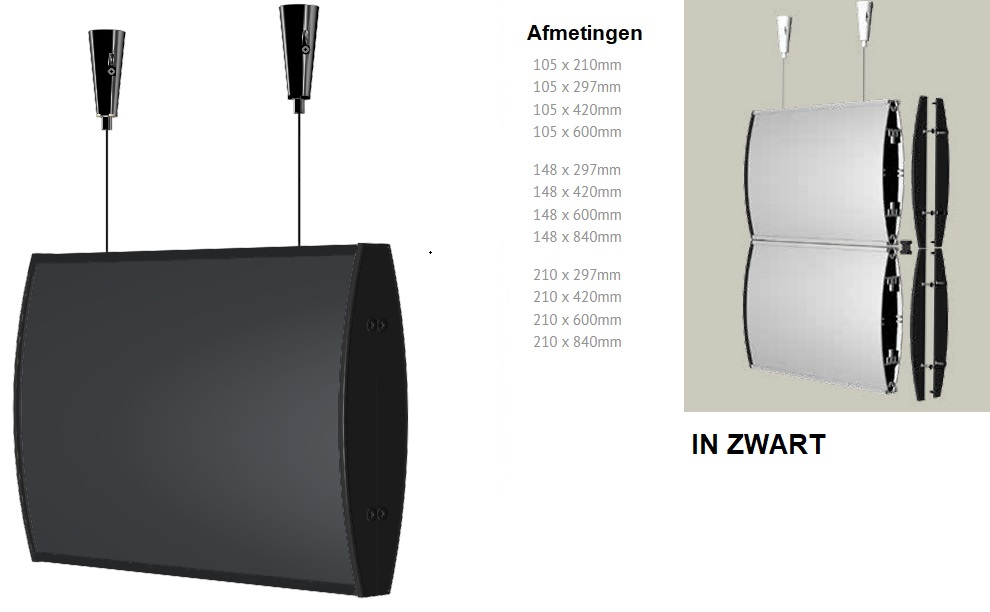 Zwart Aluminium binnenbewegwijzeringsysteem, elegant licht gebogen met zwarte kunststof afdekkapjes. Voorzien van een antireflectie folie waarachter de insert/print geplaatst wordt. Verwisselen van de print is zeer eenvoudig. Inclusief ophangset met 1,5 m kabel. Verkrijgbaar in een aantal standaardmaten. Zie voor beschikbare afmetingen bijgevoegde afbeelding.