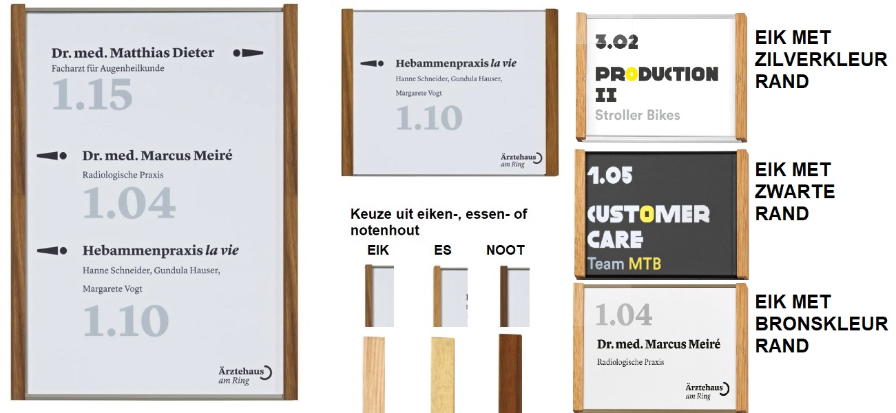 LHM-hout is een uniek nieuw design bewegwijzeringssysteem waarbij metaal en hout gecombineerd worden tot een fraaie architectonische look. Deze deurborden bestemt voor papierprint zijn uitgevoerd met zilvergrijs alu plaat en aan de zijkanten afgewerkt met een houtrand. Bij het hout gedeelte heeft u de keuze uit eiken-, essen- of notenhout dat fijnzinnig behandeld is wat een natuurlijk matte uitstraling geeft. De papierprint wordt vanaf boven er in gestoken en is beschermd met een anti-reflecterend 2 mm transparant voorzetraam. Op achterkant is dubbelzijdige tape angebracht voor montage op deur of andere gladde oppervlaktes. Kan ook beletterd worden. B2-brandvertragend. Bij bestelling keuze houtsoort vermelden. I.p.v. zilverkleurige plaat kunnen wij deze tegen een bescheiden meerprijs ook leveren met zwarte of bronskleurige plaat. Zie tevens bijgevoegd afbeeldingen.