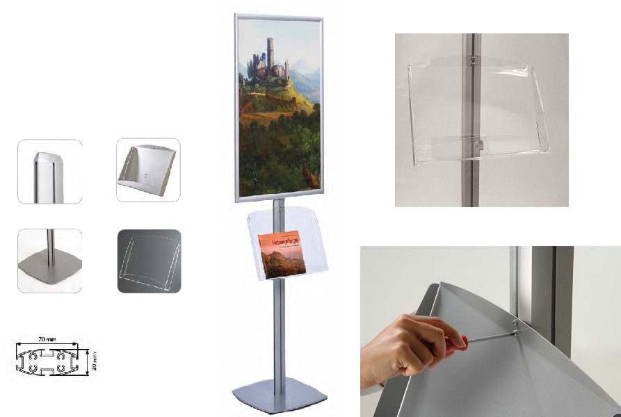 Centrale ovaalvormige aluminium staander (7 cm breed en 3 cm dik)met 4 sleuven van 192 cm hoog en een voet van 45x45 cm. Aan deze staander kan men op de door u gewenste hoogte meerdere elementen monteren. In deze uitvoering zijn dat 1 A1 kliklijst c.q. posterhouder en 1 dubbele acrylaat of stalen A4 brochurehouder. Kliklijst heeft een 25 mm profiel.