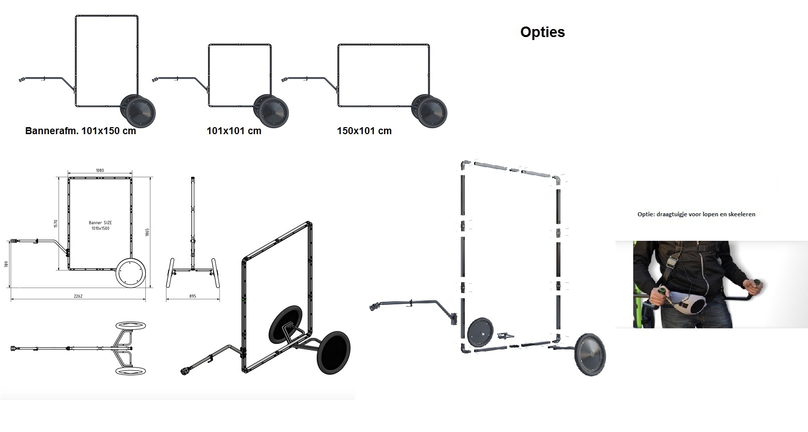 Een promotie maar dan anders. Robuust aluminium frame voor achter de fiets of gewoon om door de stad te lopen of te skaten. Het frame wordt voorzien van een dubbelzijdig geprint spandoek. Het wordt geleverd als bouwpakket. Het frame is geschikt voor een banner van 101x150 cm, 101x101 cm en 150x101 cm. De standaardkleur is zwart. Opties zijn: wandel- c.q. skatetuigje, verzwaring met gewichten en uitbreidingsset waarmee u 7 verschillende bannerafmetingen kunt realiseren. Zie voor meer info bijgevoegde video en afbeeldingen. Geprinte banner(s) tegen meerprijs.